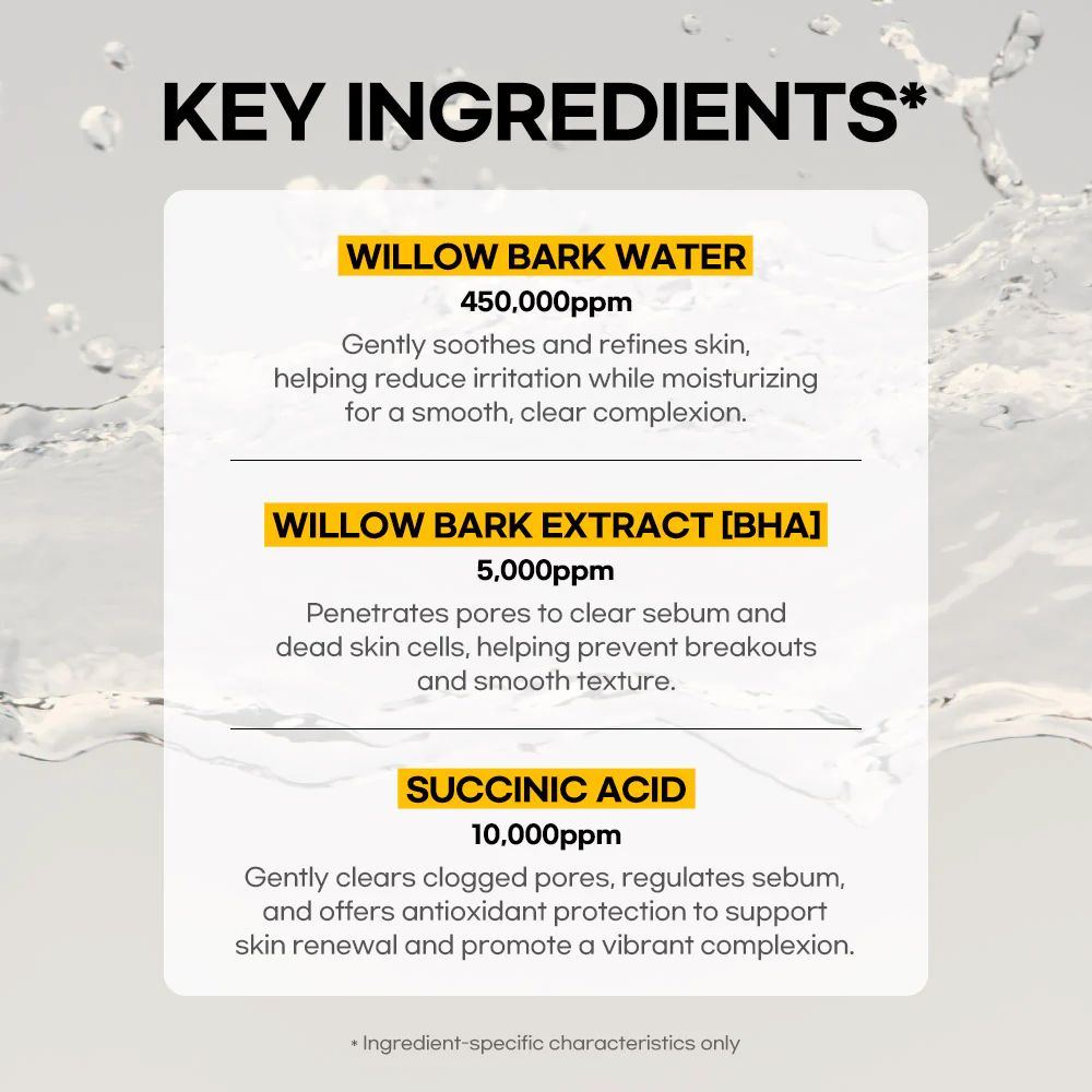 Salix Alba (Willow) Bark Water, Water, Propanediol, Butylene Glycol, Glycerin, 1,2-Hexanediol, 2,3-Butanediol, Melia Azadirachta Flower Extract, Ocimum Sanctum Leaf Extract, Melia Azadirachta Leaf Extract, Curcuma Longa (Turmeric) Root Extract, Corallina Officinalis Extract, Cynanchum Atratum Extract, Xylose, Althaea Rosea Flower Extract, Salix Alba (Willow) Bark Extract, Sodium Hyaluronate, Hydrolyzed Hyaluronic Acid, Hyaluronic Acid, Succinic Acid, Tromethamine, Betaine Salicylate, Panthenol, Citric Acid, Gluconolactone, Sodium Hyaluronate Crosspolymer, Beta-Glucan, Ethylhexylglycerin, Polyglutamic Acid, Capryloyl Salicylic Acid, Hydroxypropyltrimonium Hyaluronate, Sodium Acetylated Hyaluronate, Hydrolyzed Sodium Hyaluronate, Potassium Hyaluronate, Disodium EDTA